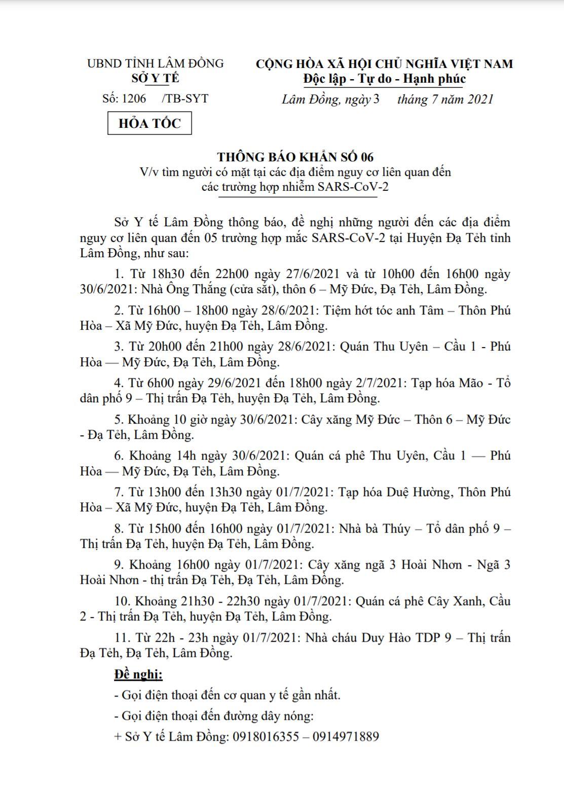 Sở Y tế Lâm Đồng thông báo, đề nghị những người đến các địa điểm nguy cơ liên quan đến 05 trường hợp nghi nhiễm SARS-CoV-2 tại Huyện Đạ Tẻh tỉnh Lâm Đồng, như sau: