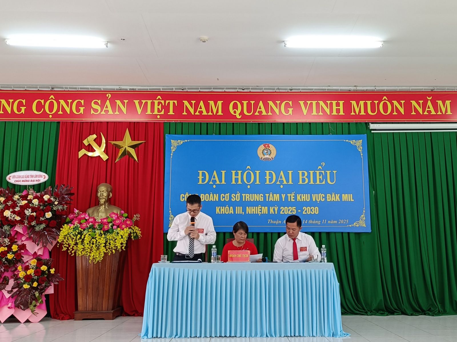 Chiều ngày 14/11/2025, Công đoàn cơ sở Trung tâm Y tế khu vực Đắk Mil đã long trọng tổ chức Đại hội đại biểu Công đoàn khóa III, nhiệm kỳ 2025-2030. Về tham dự và chỉ đạo đại hội có đồng chí Phan Thanh Thái - Ủy viên Ban Thường vụ, Phó Chủ tịch Liên đoàn Lao động tỉnh; đồng chí Nguyễn Thanh Toàn - Tổ trưởng Tổ địa bàn Đắk Nông. Về phía đơn vị có đồng chí Nguyễn Đăng Trung - Bí thư Đảng Uỷ, Giám đốc đơn vị cùng 135 đại biểu đại diện cho toàn thể đoàn viên công đoàn trong đơn vị.