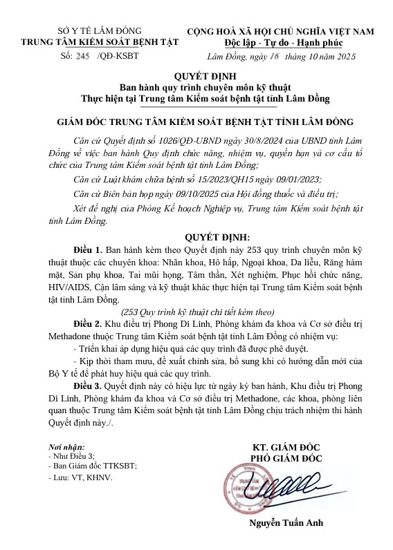Quyết định Ban hành quy trình chuyên môn kỹ thuật  Thực hiện tại Trung tâm Kiểm soát bệnh tật tỉnh Lâm Đồng