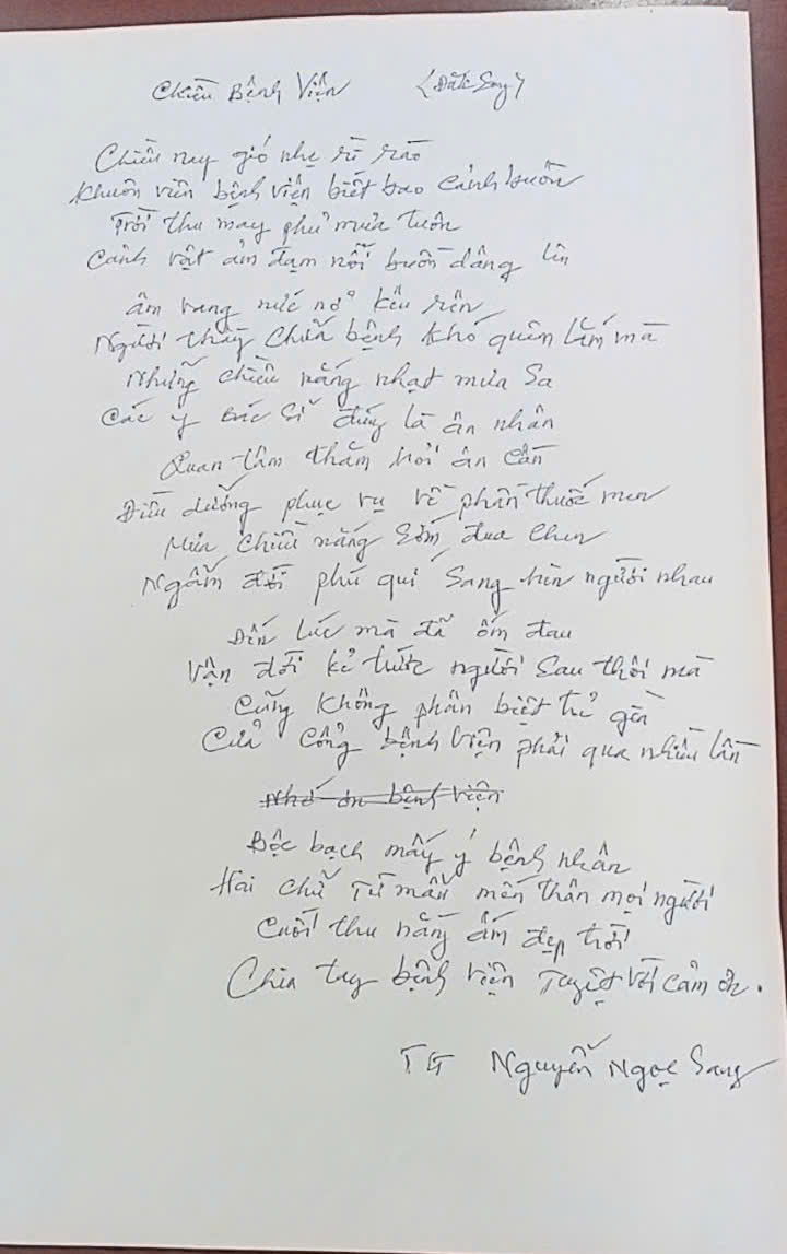 Trong quá trình điều trị tại Khoa Nội - Nhi - Nhiễm, bệnh nhân Nguyễn Ngọc Sang, sinh năm 1950, trú tại thôn 10, xã Trường Xuân, đã dành tặng đội ngũ y, bác sĩ, điều dưỡng của Trung tâm Y tế khu vực Đắk Song bài thơ mang tên “Chiều Bệnh viện”.