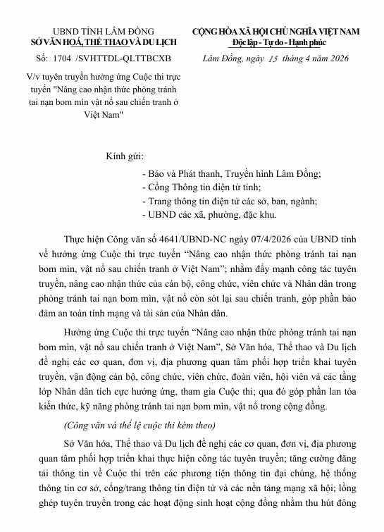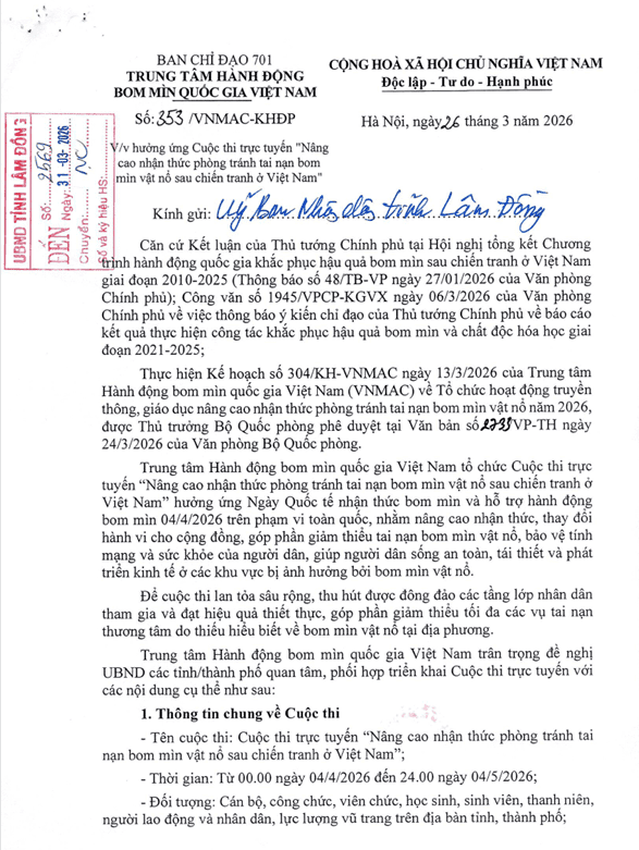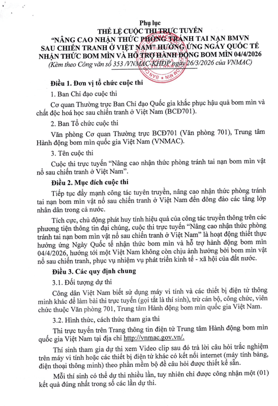 Tuyên truyền hưởng ứng Cuộc thi trực tuyến "Nâng cao nhận thức phòng tránh tai nạn bom mìn vật nổ sau chiến tranh ở Việt Nam" Ngày đăng: 20/04/2026 - 07:59 Chia sẻ: | In bài viết