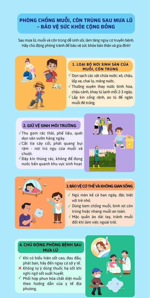 Sau mưa lũ, nước đọng và môi trường ẩm ướt tạo điều kiện cho muỗi, ruồi, gián và các loại côn trùng phát triển mạnh, làm tăng nguy cơ bùng phát các bệnh truyền nhiễm như sốt xuất huyết, tay chân miệng, viêm da hoặc đau mắt đỏ. Theo Bộ Y tế, chỉ cần một nắp chai nước đọng cũng đủ để muỗi truyền bệnh sinh sản.