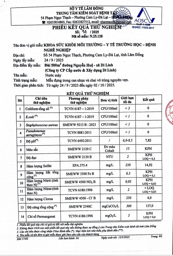 Báo cáo Kết quả ngoại kiểm chất lượng nước sạch sử dụng cho mục đích sinh hoạt tại Công ty Cổ phần Cấp nước và Xây dựng Di Linh