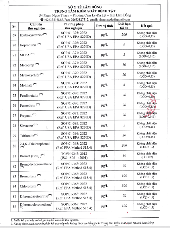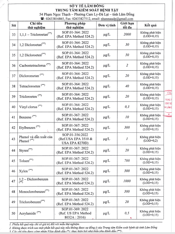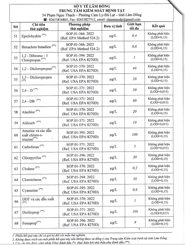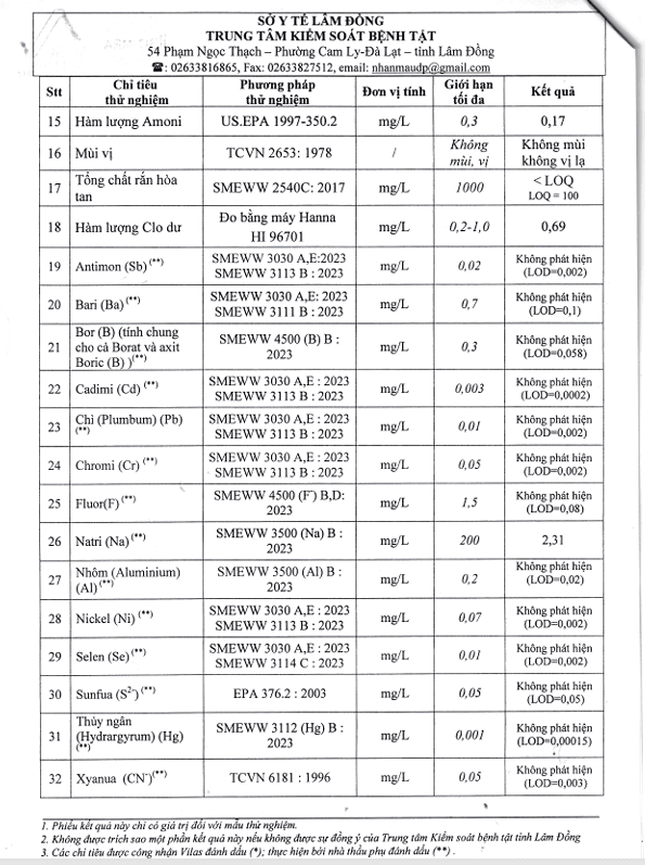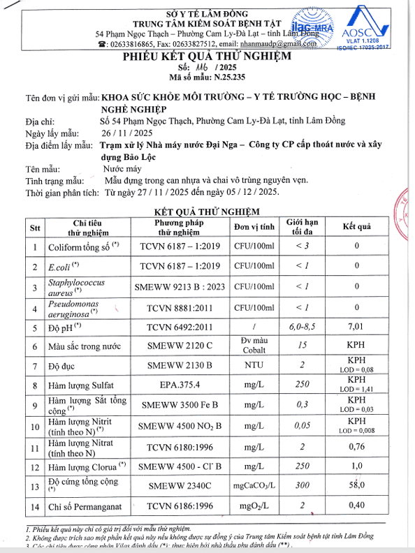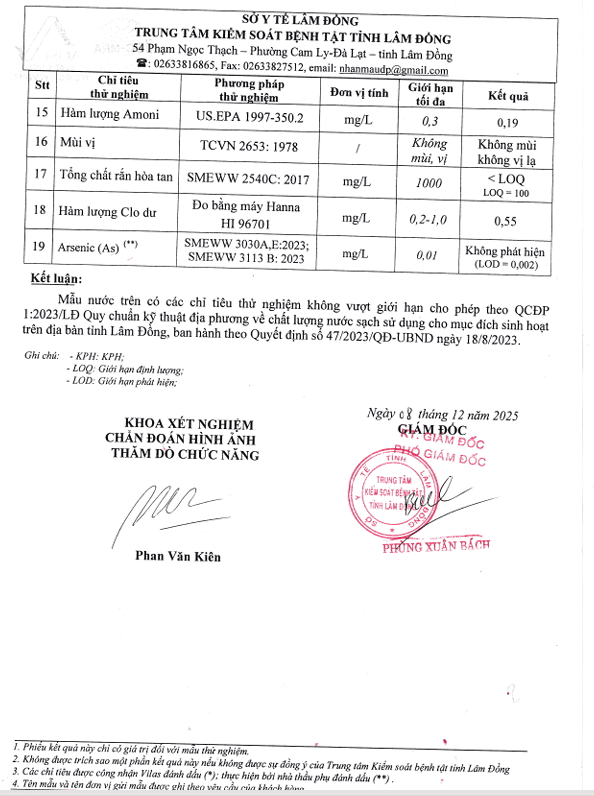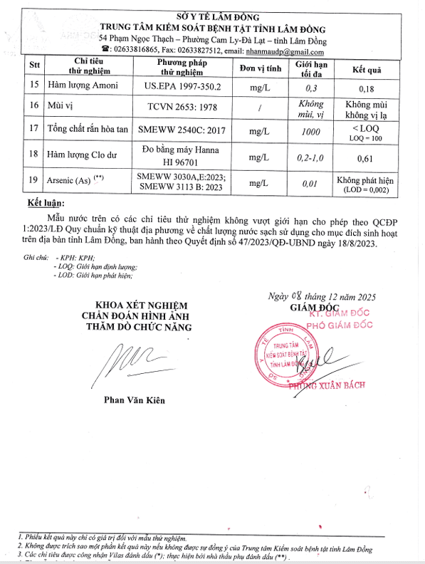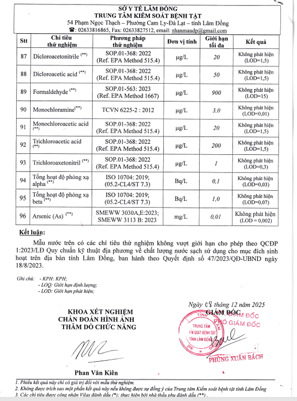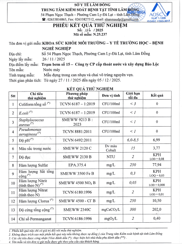 Kết quả ngoại kiểm chất lượng nước sạch sử dụng cho mục đích sinh hoạt tại Công ty Cổ phần Cấp thoát nước Lâm Đồng năm 2025