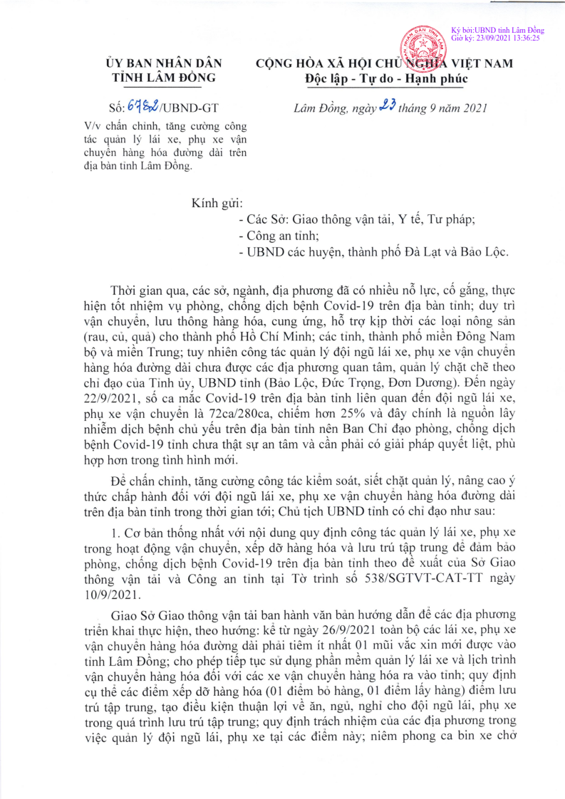 Giao Sở Giao thông vận tải ban hành văn bản hướng dẫn để các địa phương triển khai thực hiện, theo hướng: kể từ ngày 26/9/2021 toàn bộ các lái xe, phụ xe vận chuyển hàng hóa đường dài phải tiêm ít nhất 01 mũi vắc xin mới được vào tỉnh Lâm Đồng; cho phép tiếp tục sử dụng phần mềm quản lý lái xe và lịch trình vận chuyển hàng hóa đối với các xe vận chuyển hàng hóa ra vào tỉnhquy định cụ thể các điểm xếp dỡ hàng hóa (01 điểm bỏ hàng, 01 điểm lấy hàng) điểm lưu trú tập trung, tạo điều kiện thuận lợi về ăn, ngủ, nghỉ cho đội ngũ lái, phụ xe trong quá trình lưu trú tập trung; quy định trách nhiệm của các địa phương trong việc quản lý đội ngũ lái, phụ xe tại các điểm này; niêm phong ca bin xe chở hàng hóa tại các chốt giáp ranh trước khi vào tỉnh...; báo cáo UBND tỉnh trước ngày 24/9/2021 trước khi ban hành hướng dẫn nêu trên.