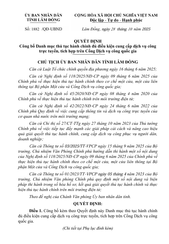 Công bố Danh mục thủ tục hành chính đủ điều kiện cung cấp dịch vụ công  trực tuyến, tích hợp trên Cổng Dịch vụ công quốc gia