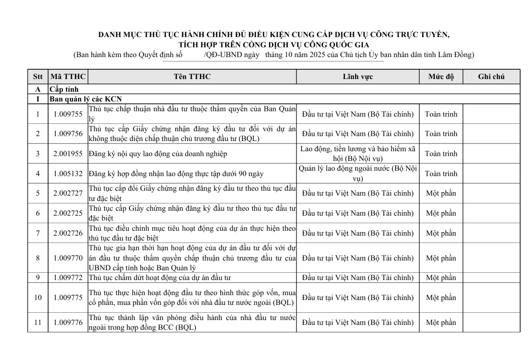 Công bố Danh mục thủ tục hành chính đủ điều kiện cung cấp dịch vụ công trực tuyến, tích hợp trên Cổng Dịch vụ công quốc gia