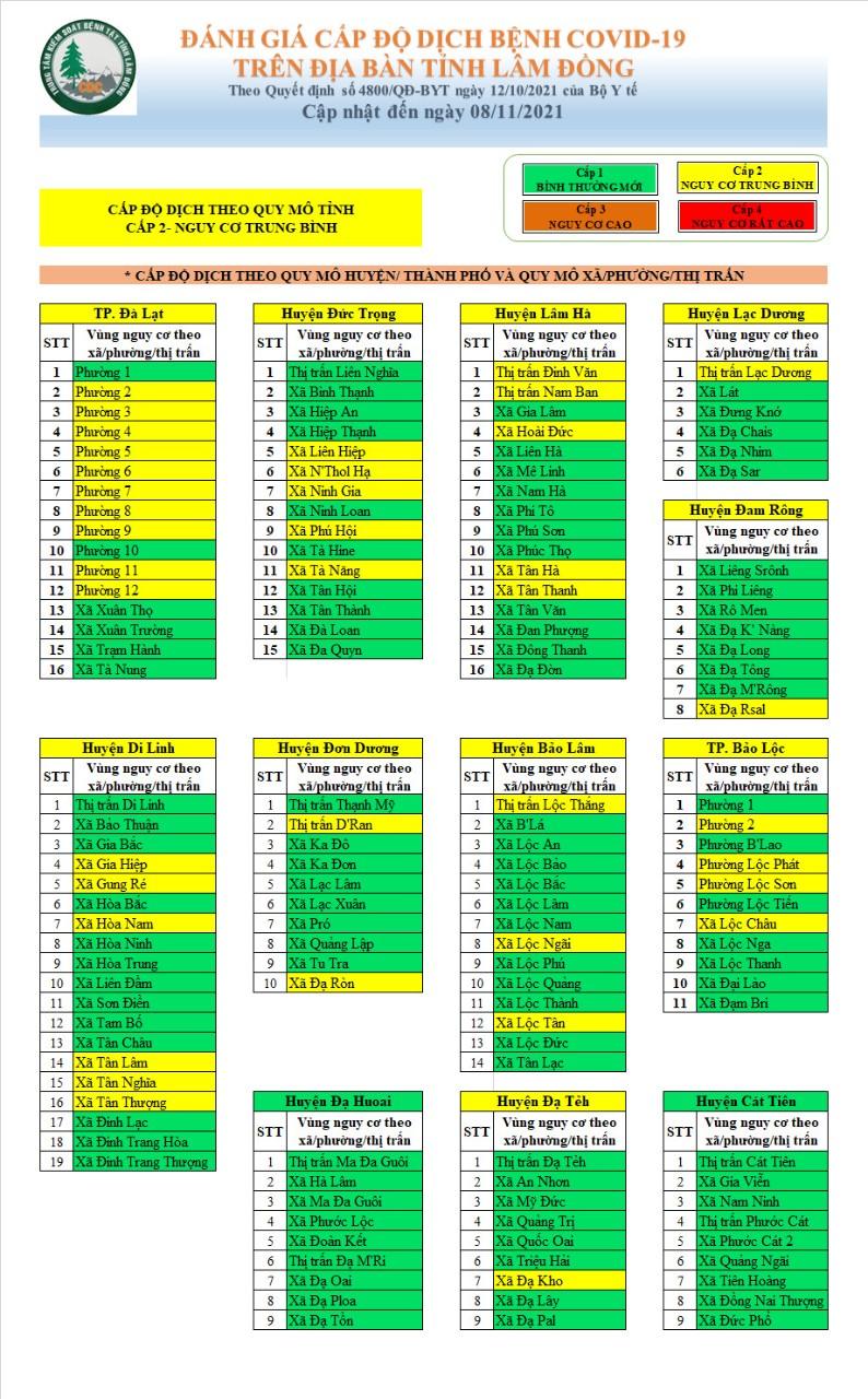 Đánh giá cấp độ dịch bệnh COVID-19 trên địa bàn tỉnh Lâm Đồng (cập nhật đến ngày 08/11/2021)
