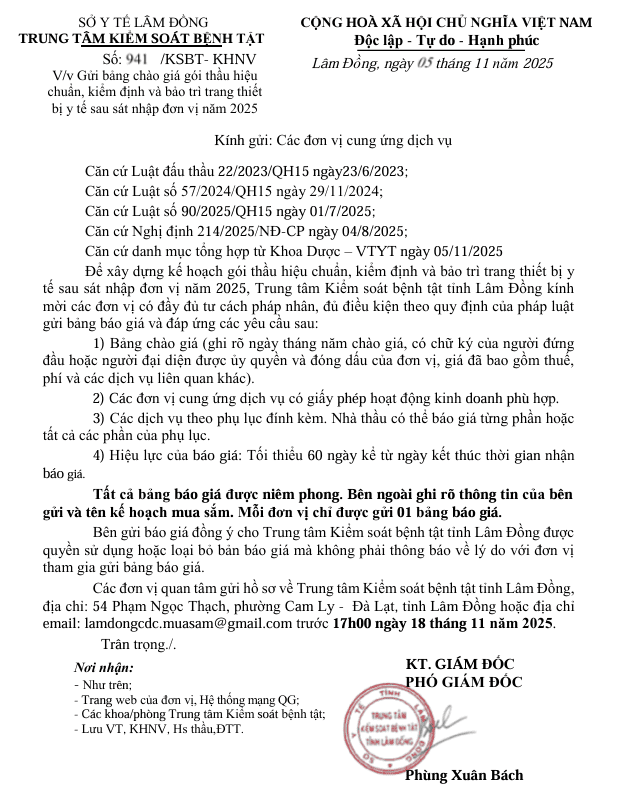 | 52 | Tủ ấm WTB BINDER | Cái | 1 | Hiệu chuẩn 37 độ C, ± 1 độ C, bảo trì | Đường Lê Duẩn, Phường Phan Thiết, Tỉnh Lâm Đồng | ||