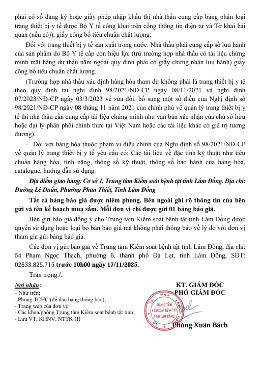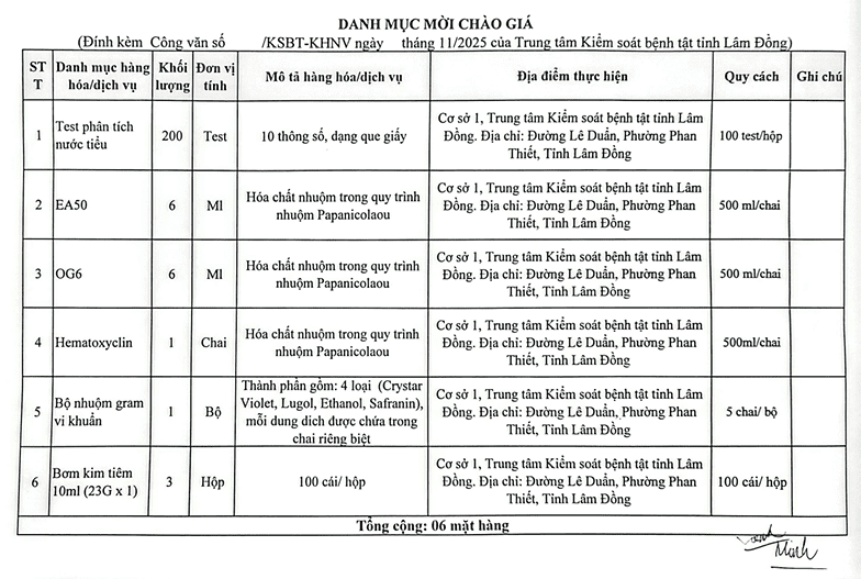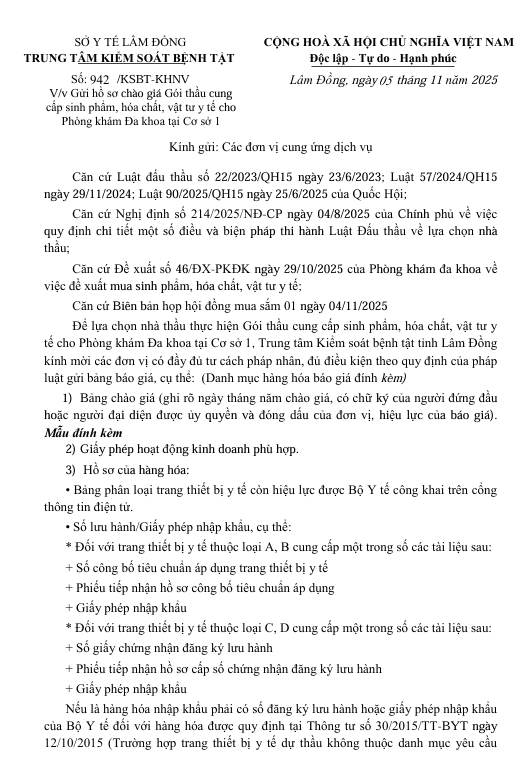Cập nhật lúc: 15:34 - 05/11/2025 Gửi hồ sơ chào giá Gói thầu cung cấp sinh phẩm, hóa chất, vật tư y tế cho Phòng khám Đa khoa tại Cơ sở 1 | Giới thiệu Kính gửi: Các đơn vị cung ứng dịch vụ