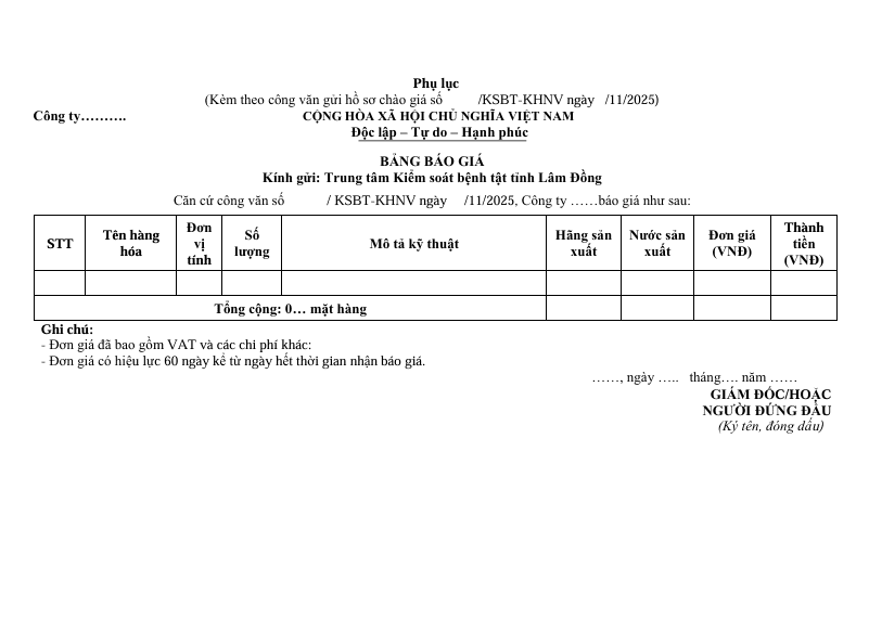 Gửi bảng chào giá gói thầu hiệu chuẩn, kiểm định và bảo trì trang thiết bị y tế sau sát nhập đơn vị năm 2025