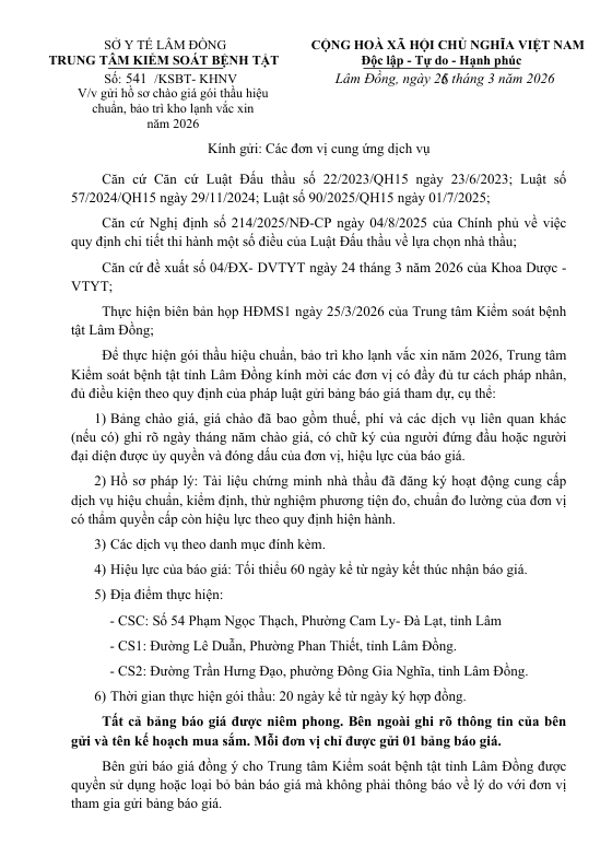Cập nhật lúc: 14:11 - 26/03/2026 Gửi hồ sơ chào giá gói thầu hiệu chuẩn, bảo trì kho lạnh vắc xin năm 2026 | Giới thiệu