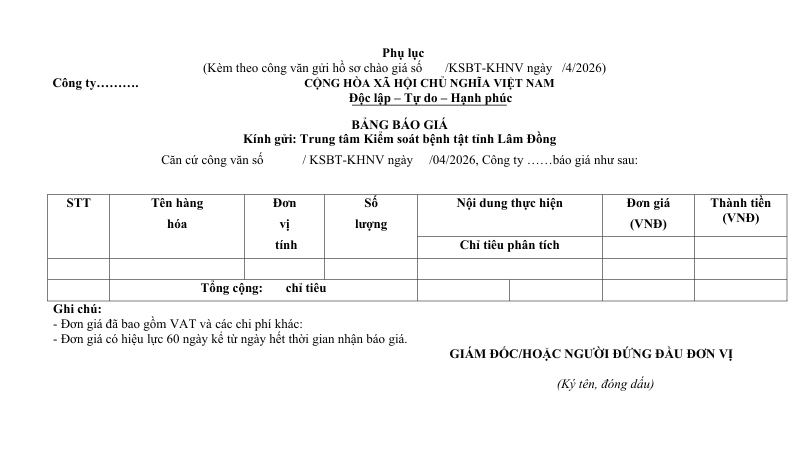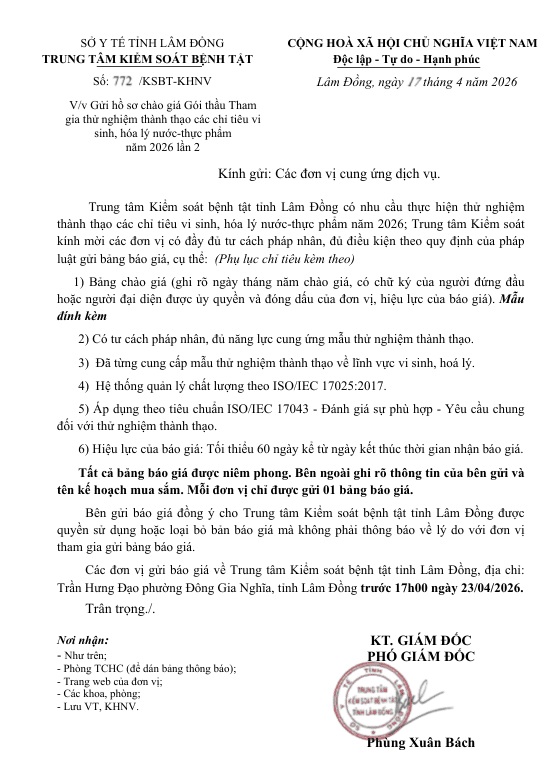 Gửi hồ sơ chào giá Gói thầu tham gia thử nghiệm thành thạo các chỉ tiêu vi sinh, hóa lý nước-thực phẩm năm 2026