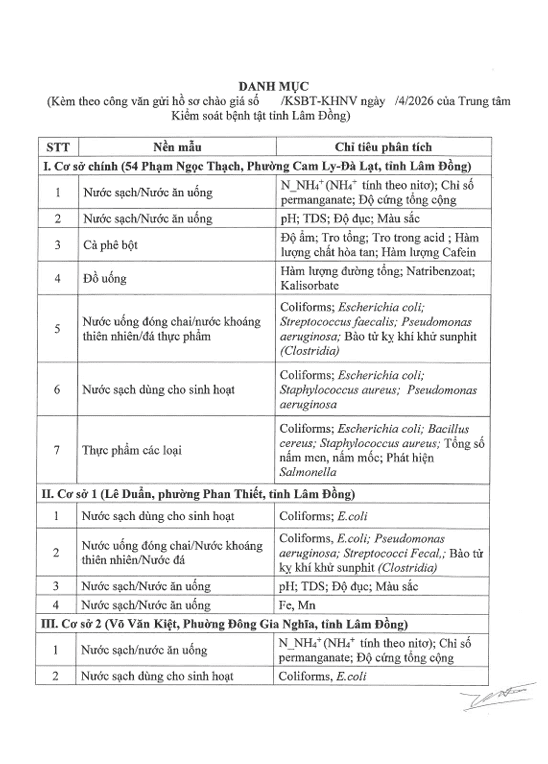 Gửi hồ sơ chào giá Gói thầu Tham gia thử nghiệm thành thạo các chỉ tiêu vi sinh, hóa lý nước-thực phẩm năm 2026 lần 2
