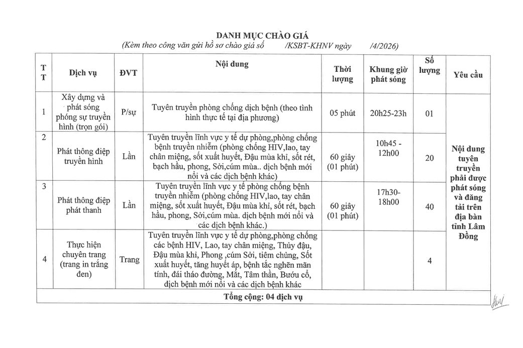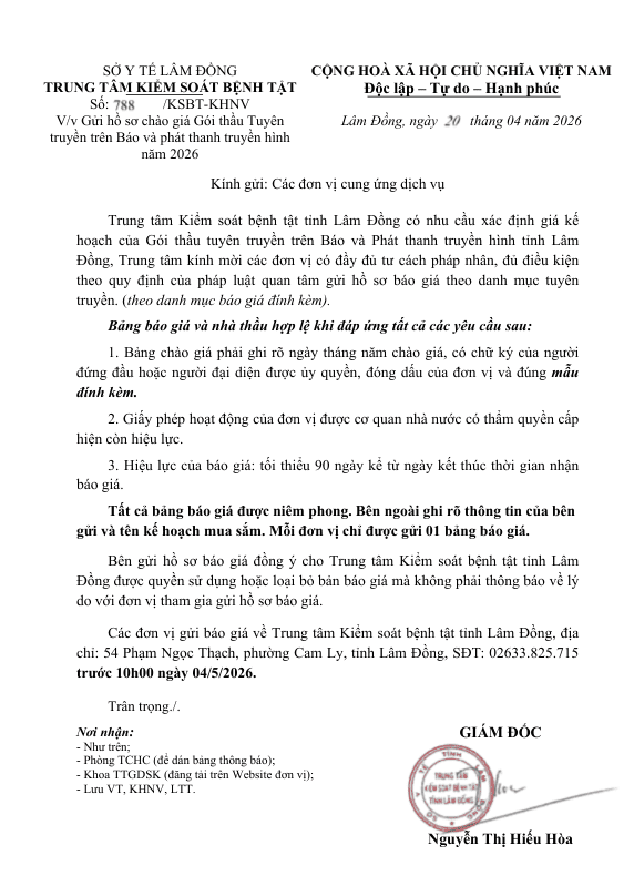 Gửi hồ sơ chào giá Gói thầu Tuyên truyền trên Báo và phát thanh truyền hình năm 2026 Ngày đăng: 20/04/2026 - 14:47 Chia sẻ: | In bài viết
