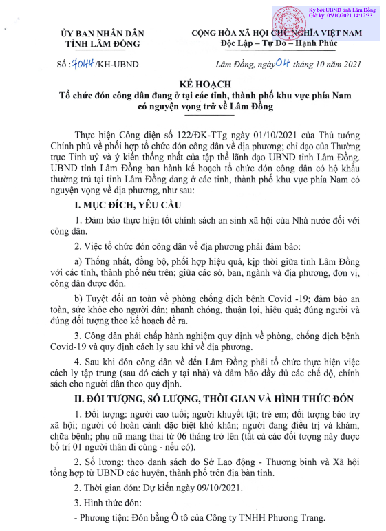 KẾ HOẠCH Tổ chức đón công dân đang ở tại các tỉnh, thành phố khu vực phía Nam có nguyện vọng trở về Lâm Đồng