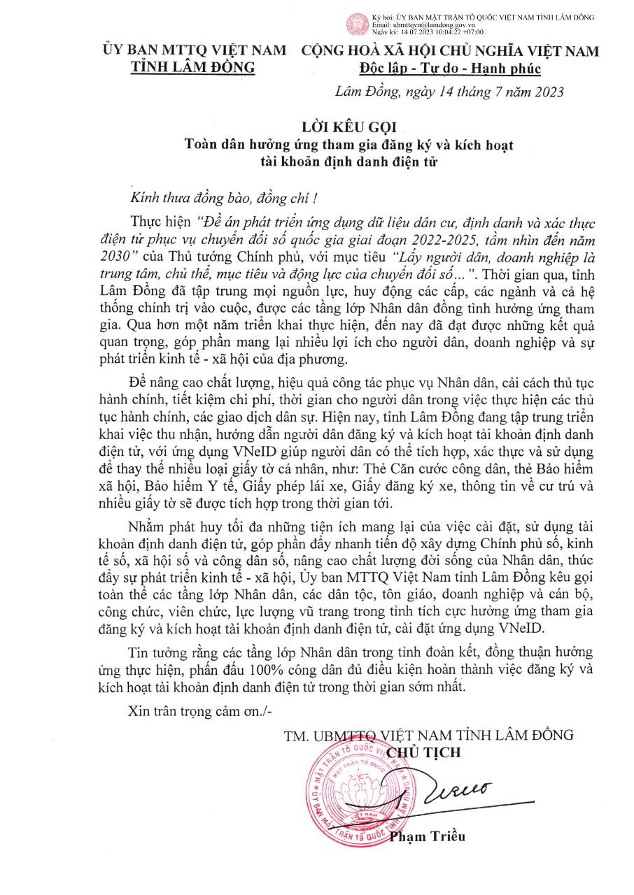 Ủy ban MTTQ tỉnh Lâm Đồng kêu gọi toàn dân hưởng ứng tham gia đăng ký và kích hoạt tài khoản định danh điện tử