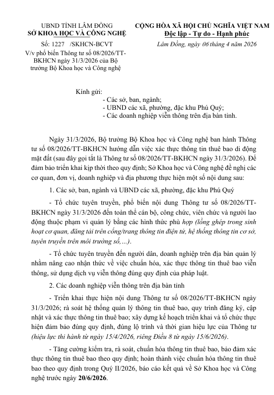 Phổ biến Thông tư số 08/2026/TT BKHCN ngày 31/3/2026 của Bộ trưởng Bộ Khoa học và Công nghệ Ngày đăng: 13/04/2026 - 11:07 Chia sẻ: | In bài viết