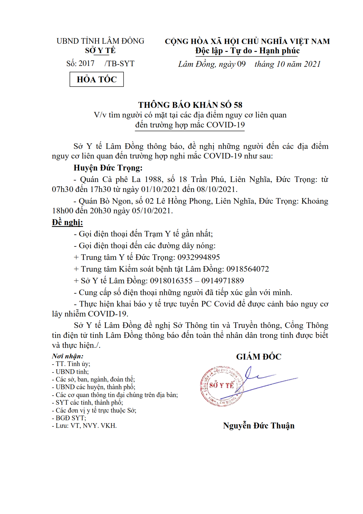 Sở Y tế Lâm Đồng ban hành văn bản số 2017/TB-SYT ngày 09/10/2021 về việc tìm người có mặt tại các địa điểm nguy cơ liên quan đến trường hợp mắc COVID-19