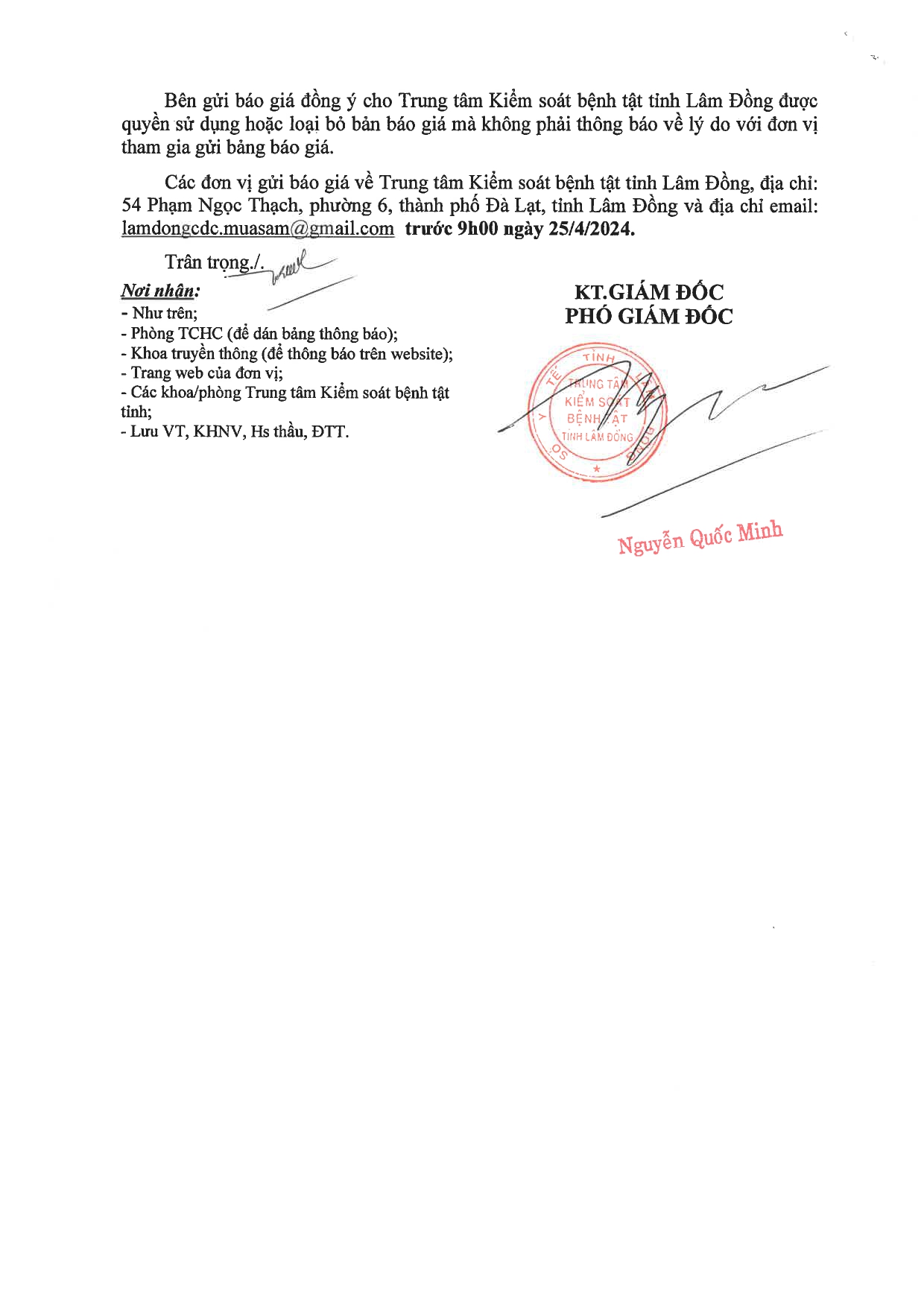 Thông báo gia hạn thời gian gửi hồ sơ chào giá gói thầu mua bóng điện, ổ điện dây kết nối vòi xịt năm 2024