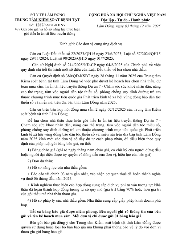 Cập nhật lúc: 16:39 - 03/12/2025 Thông báo Gửi báo giá và hồ sơ năng lực thực hiện gói thầu In ấn tài liệu truyền thông | Giới thiệu