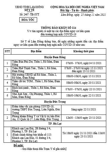 Sở Y tế Lâm Đồng ban hành văn bản số 2467/TB-SYT ngày 25/11/2021 về việc tìm người có mặt tại các địa điểm nguy cơ liên quan đến trường hợp mắc COVID-19