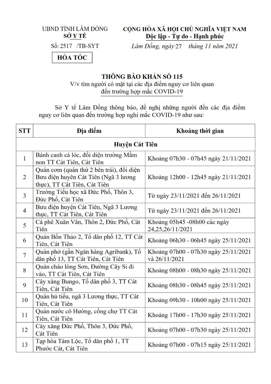 Sở Y tế Lâm Đồng ban hành văn bản số 2517/TB-SYT ngày 27/11/2021 về việc tìm người có mặt tại các địa điểm nguy cơ liên quan đến trường hợp mắc COVID-19