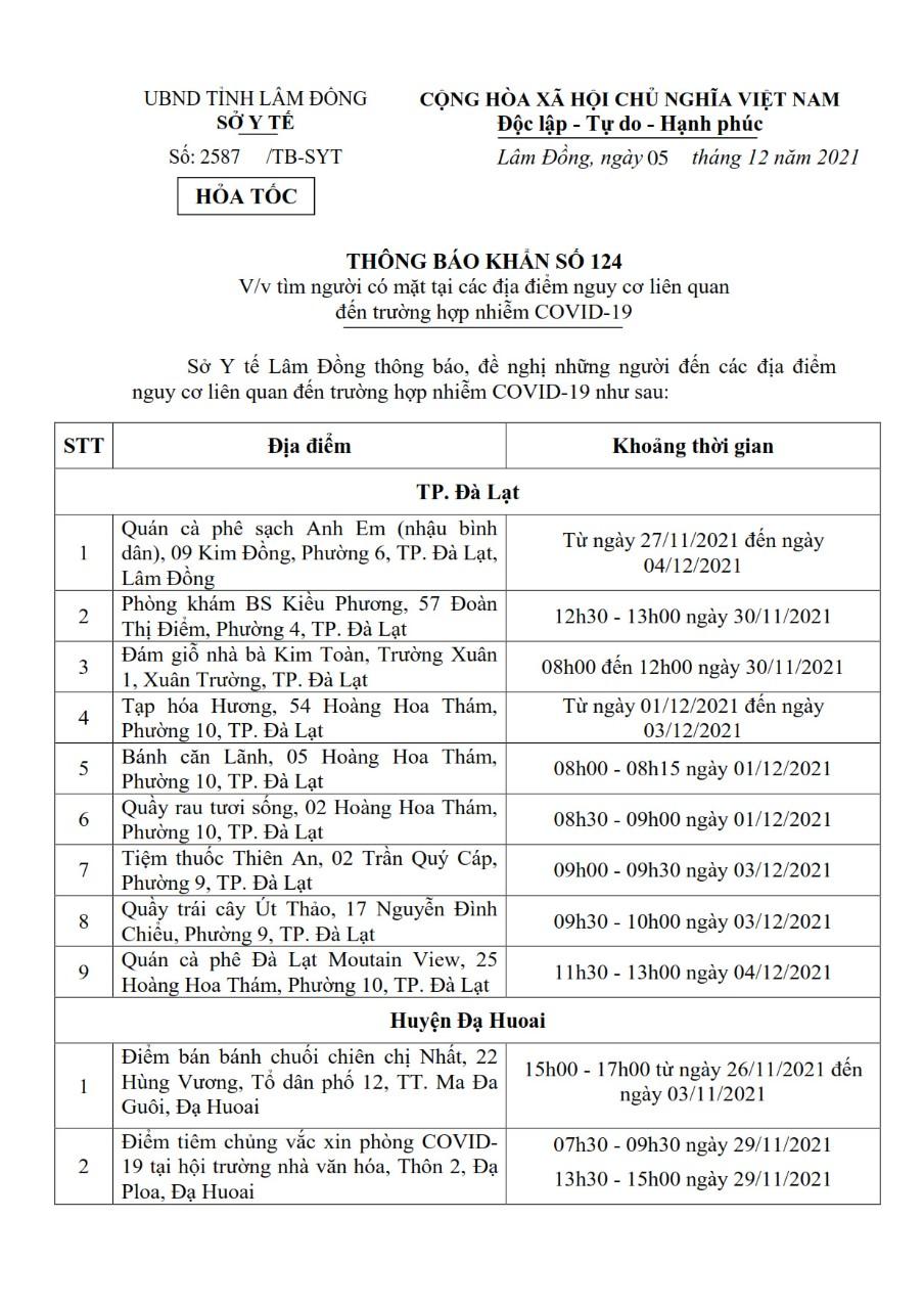 Sở Y tế Lâm Đồng ban hành thông báo khẩn về việc tìm người có mặt tại các địa điểm nguy cơ liên quan đến trường hợp mắc COVID-19