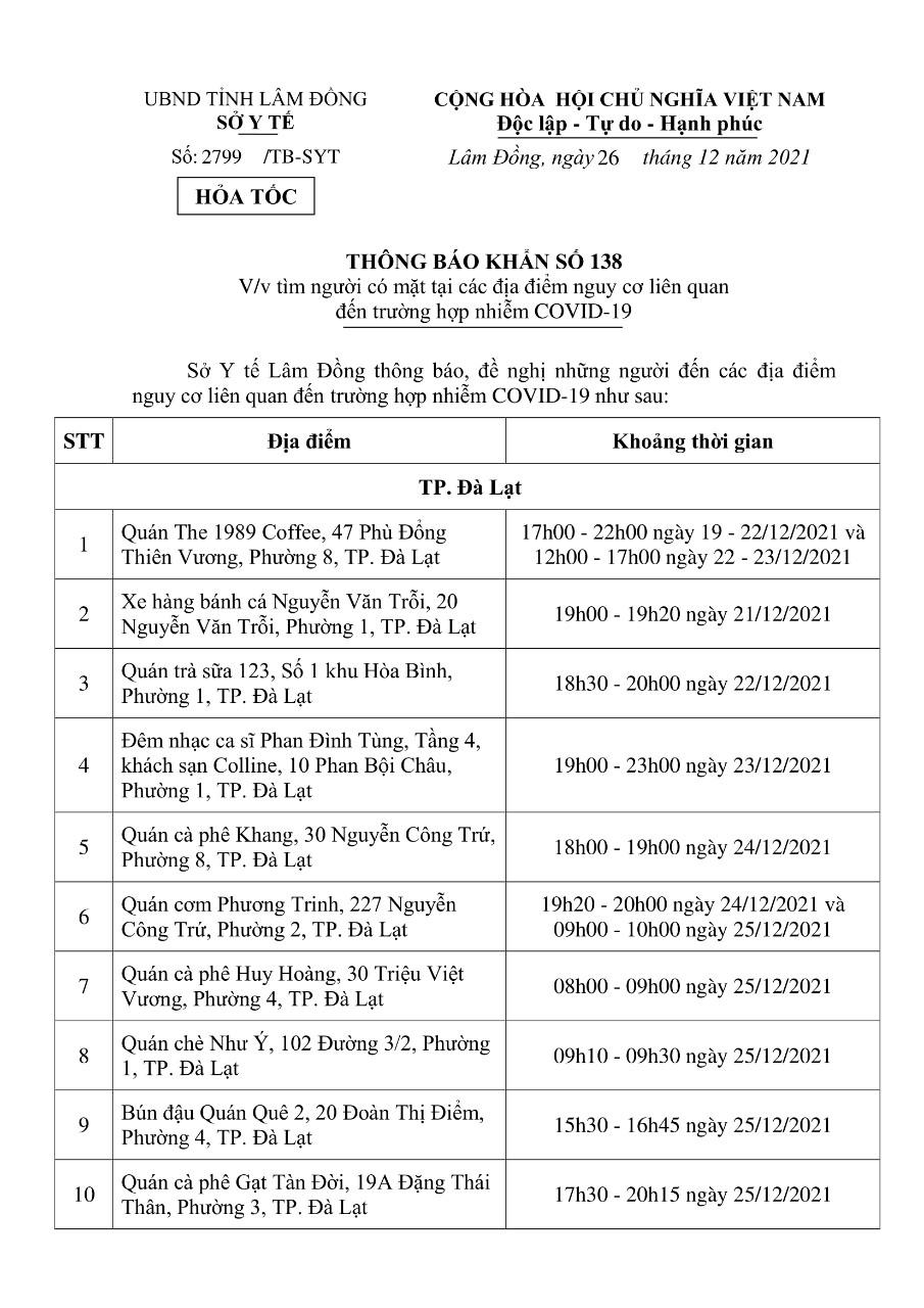 THÔNG BÁO KHẨN SỐ 138 về việc tìm người có mặt tại các địa điểm nguy cơ liên quan đến trường hợp mắc COVID-19