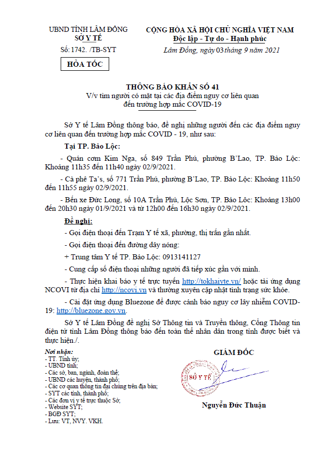 Sở Y tế Lâm Đồng ban hành văn bản số 1742/TB-SYT ngày 03/9/2021 về việc tìm người có mặt tại các địa điểm nguy cơ liên quan đến trường hợp mắc COVID-19
