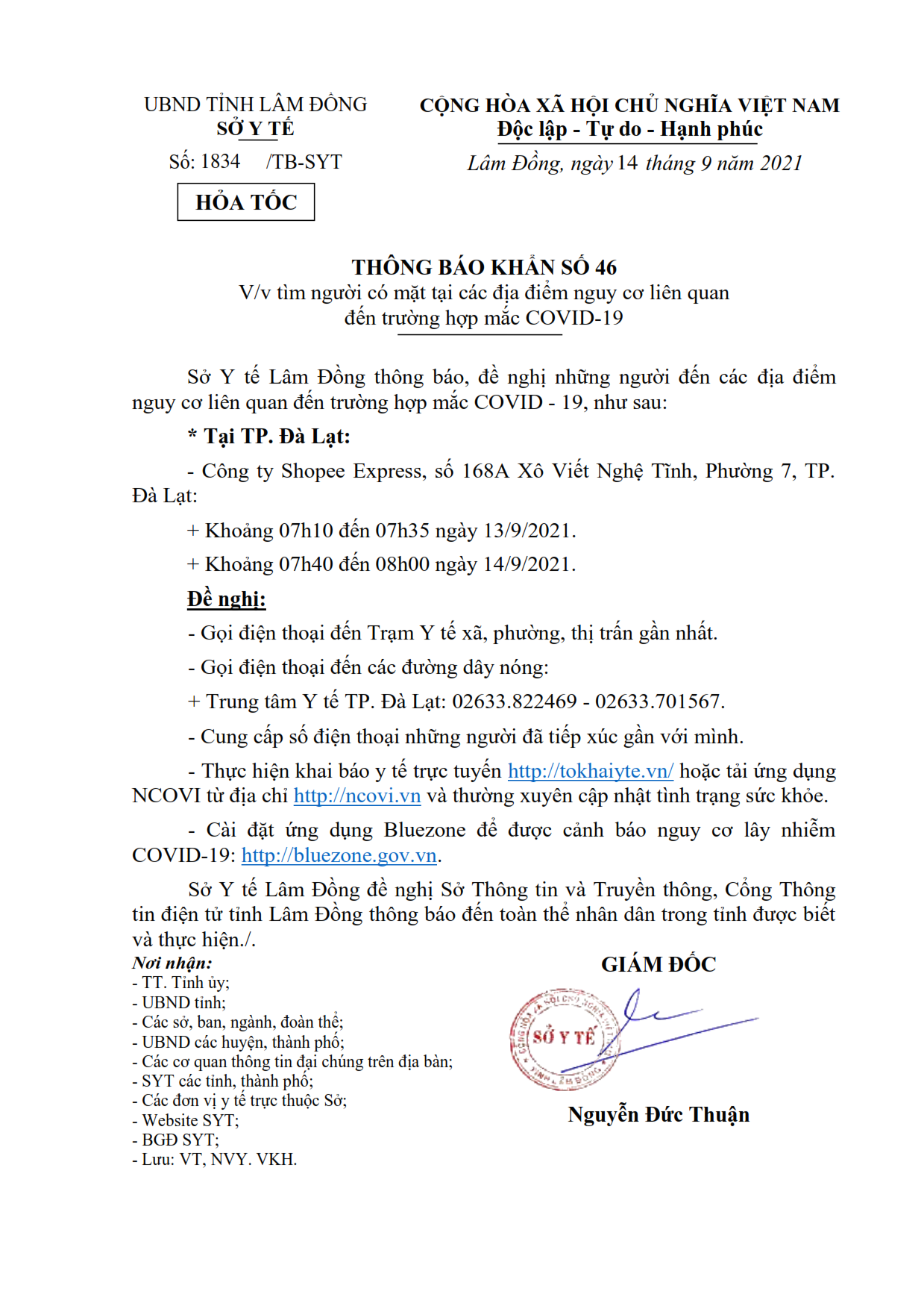 Sở Y tế Lâm Đồng ban hành văn bản số 1834/TB-SYT ngày 14/9/2021 về việc tìm người có mặt tại các địa điểm nguy cơ liên quan đến trường hợp mắc COVID-19