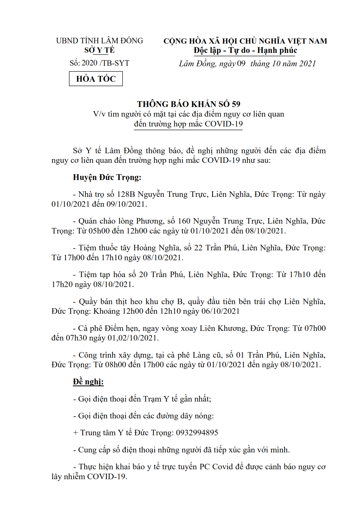 Sở Y tế Lâm Đồng ban hành văn bản số 2020/TB-SYT ngày 09/10/2021 về việc tìm người có mặt tại các địa điểm nguy cơ liên quan đến trường hợp mắc COVID-19