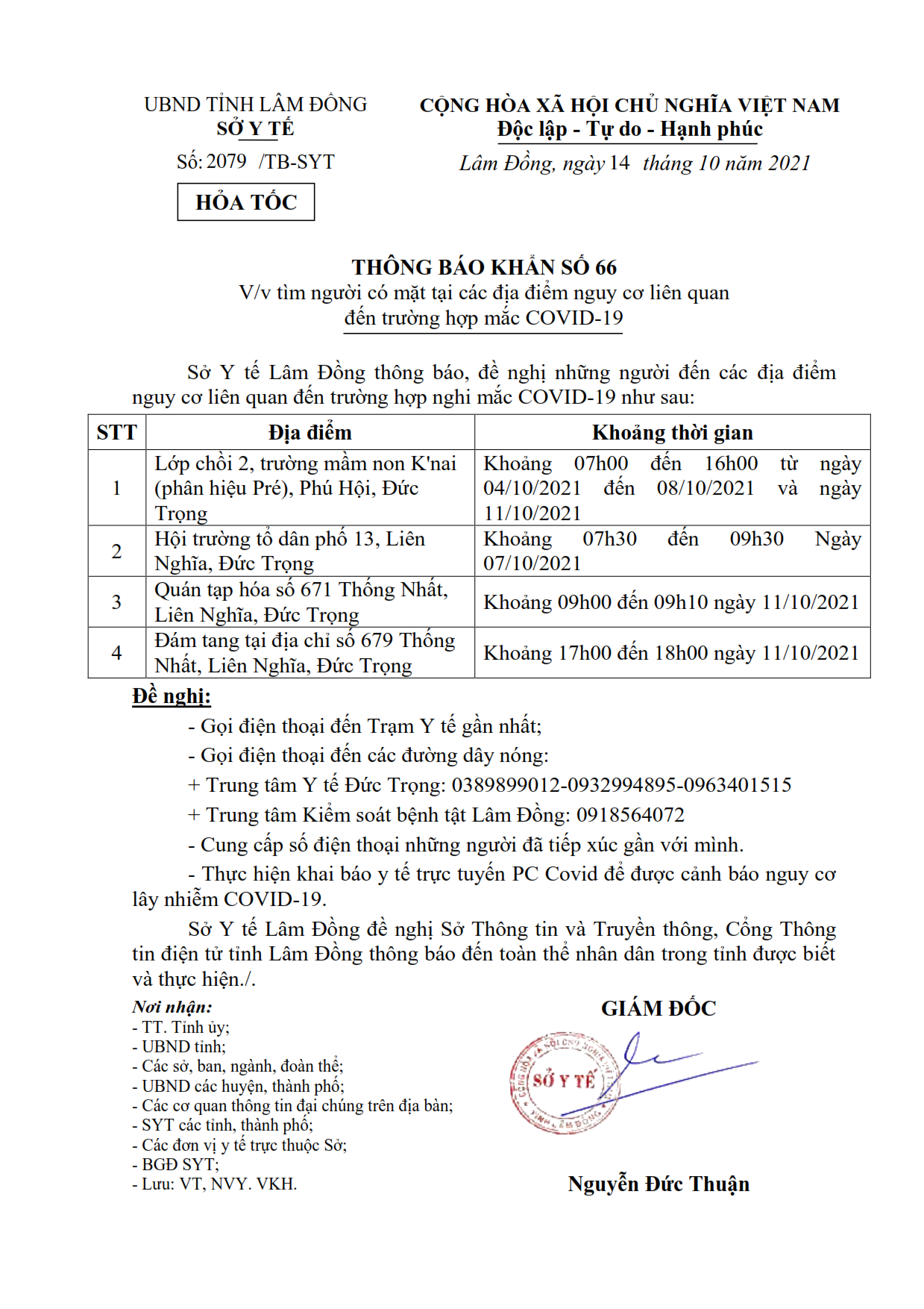 Sở Y tế Lâm Đồng ban hành văn bản số 2079/TB-SYT ngày 14/10/2021 về việc tìm người có mặt tại các địa điểm nguy cơ liên quan đến trường hợp mắc COVID-19