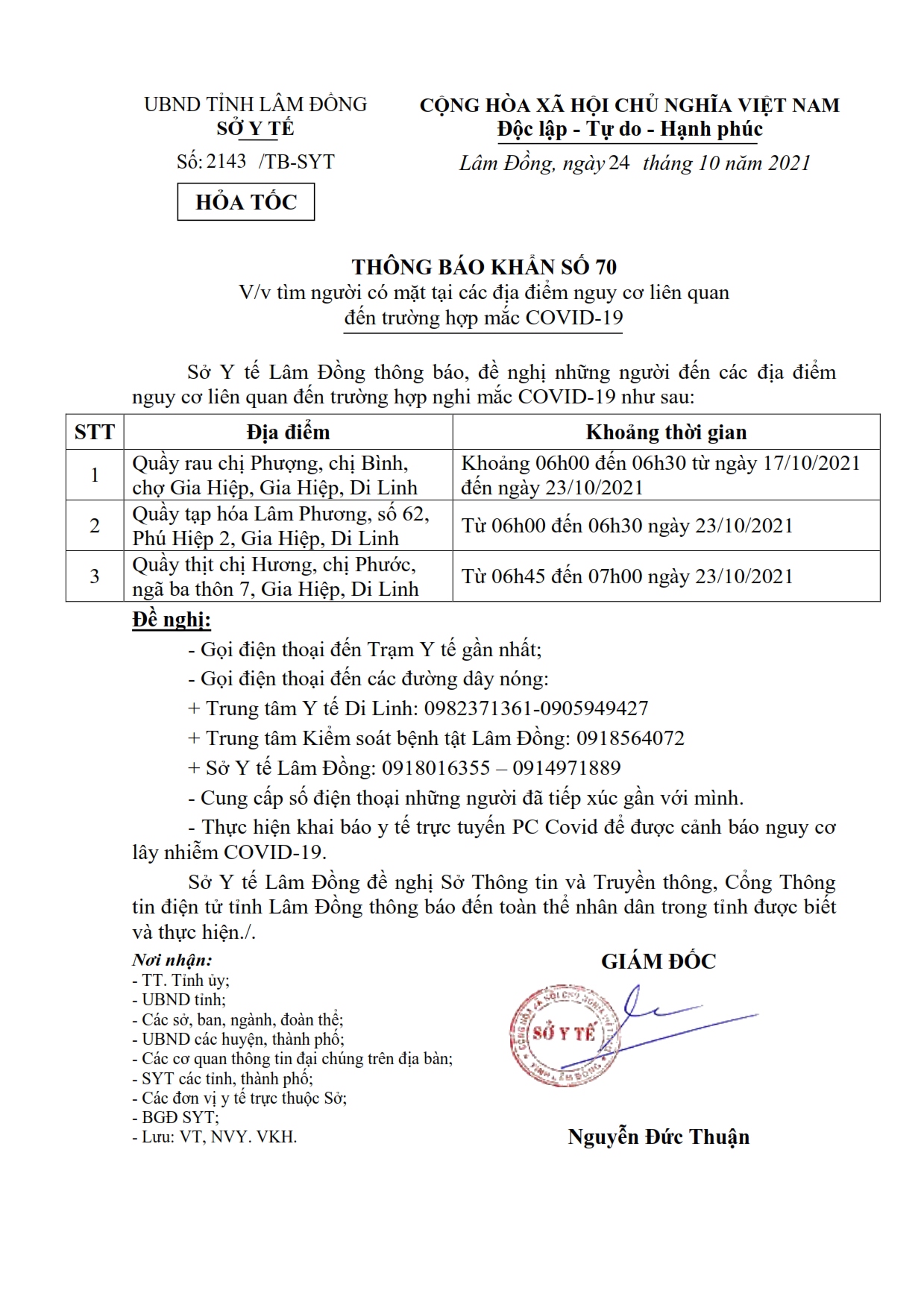 Sở Y tế Lâm Đồng ban hành văn bản số 2143/TB-SYT ngày 24/10/2021 về việc tìm người có mặt tại các địa điểm nguy cơ liên quan đến trường hợp mắc COVID-19