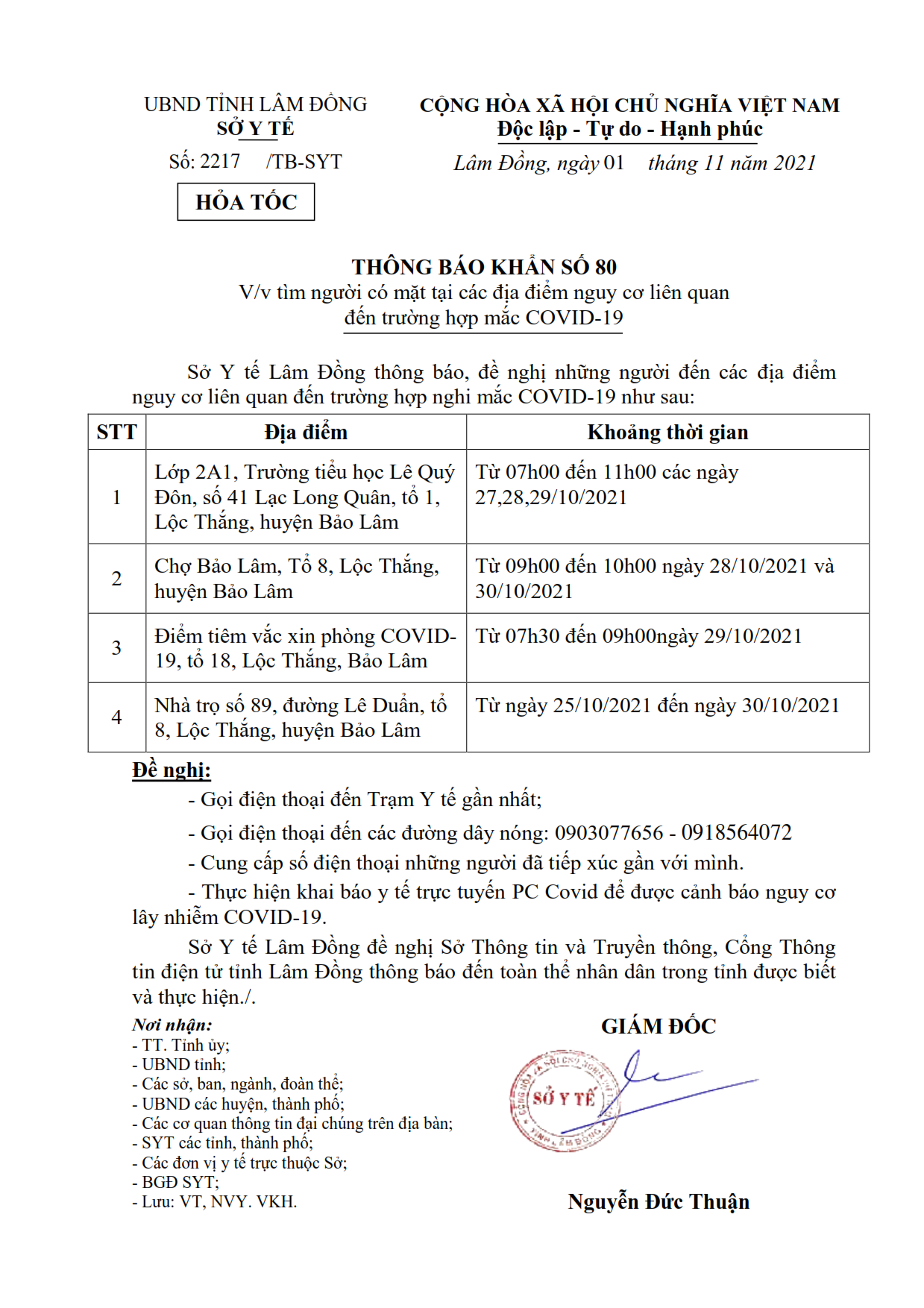 Sở Y tế Lâm Đồng ban hành văn bản số 2217/TB-SYT ngày 01/11/2021 về việc tìm người có mặt tại các địa điểm nguy cơ liên quan đến trường hợp mắc COVID-19