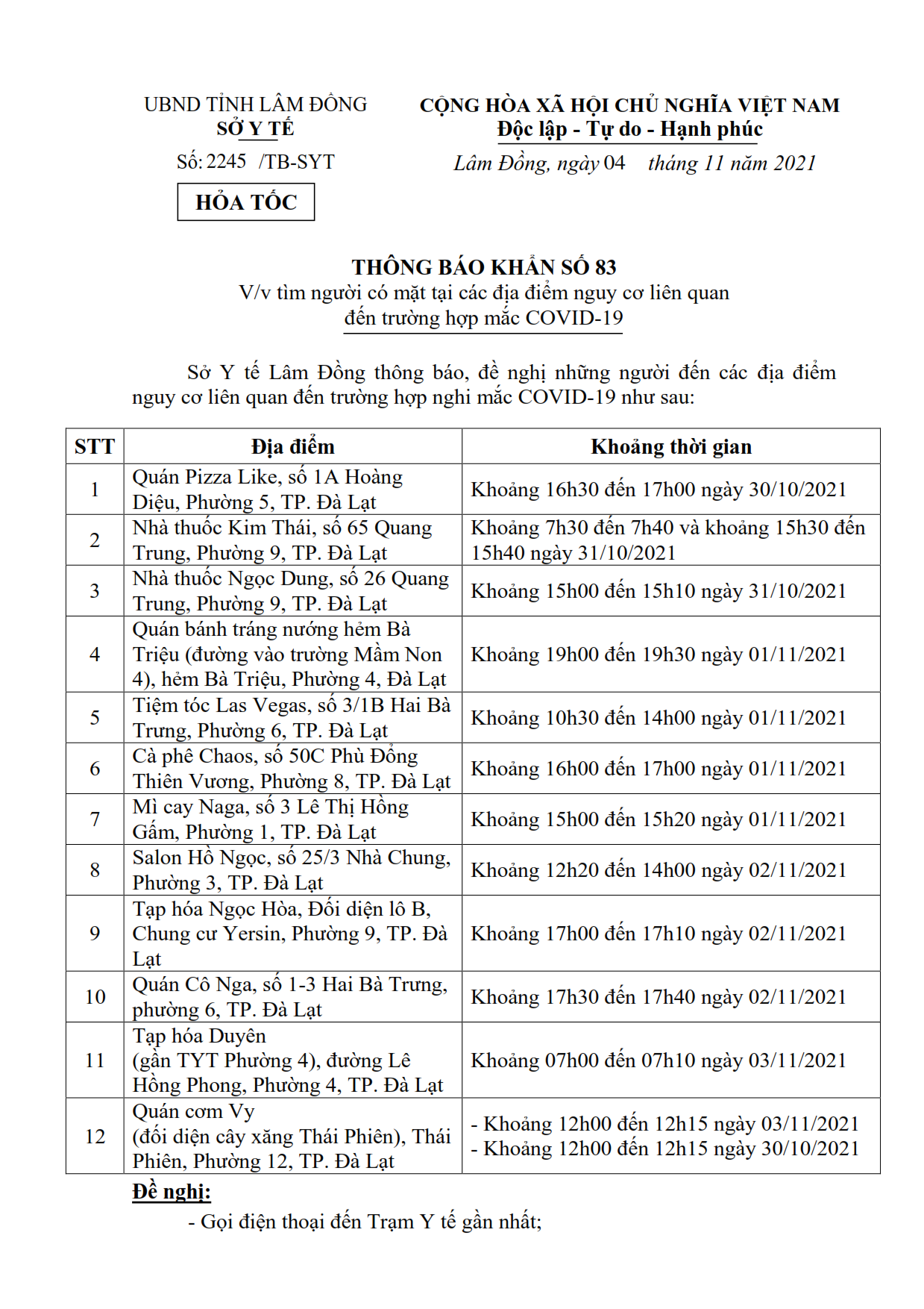 Sở Y tế Lâm Đồng ban hành văn bản số 2245/TB-SYT ngày 04/11/2021 về việc tìm người có mặt tại các địa điểm nguy cơ liên quan đến trường hợp mắc COVID-19