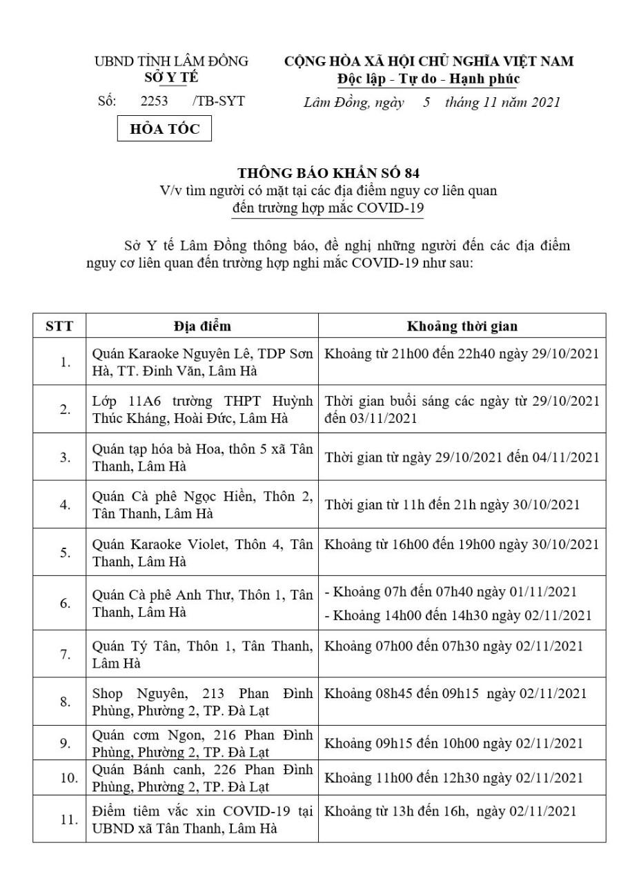 Sở Y tế Lâm Đồng ban hành văn bản số 2253/TB-SYT ngày 05/11/2021 về việc tìm người có mặt tại các địa điểm nguy cơ liên quan đến trường hợp mắc COVID-19 tại Thành phố Đà Lạt và Huyện Lâm Hà.