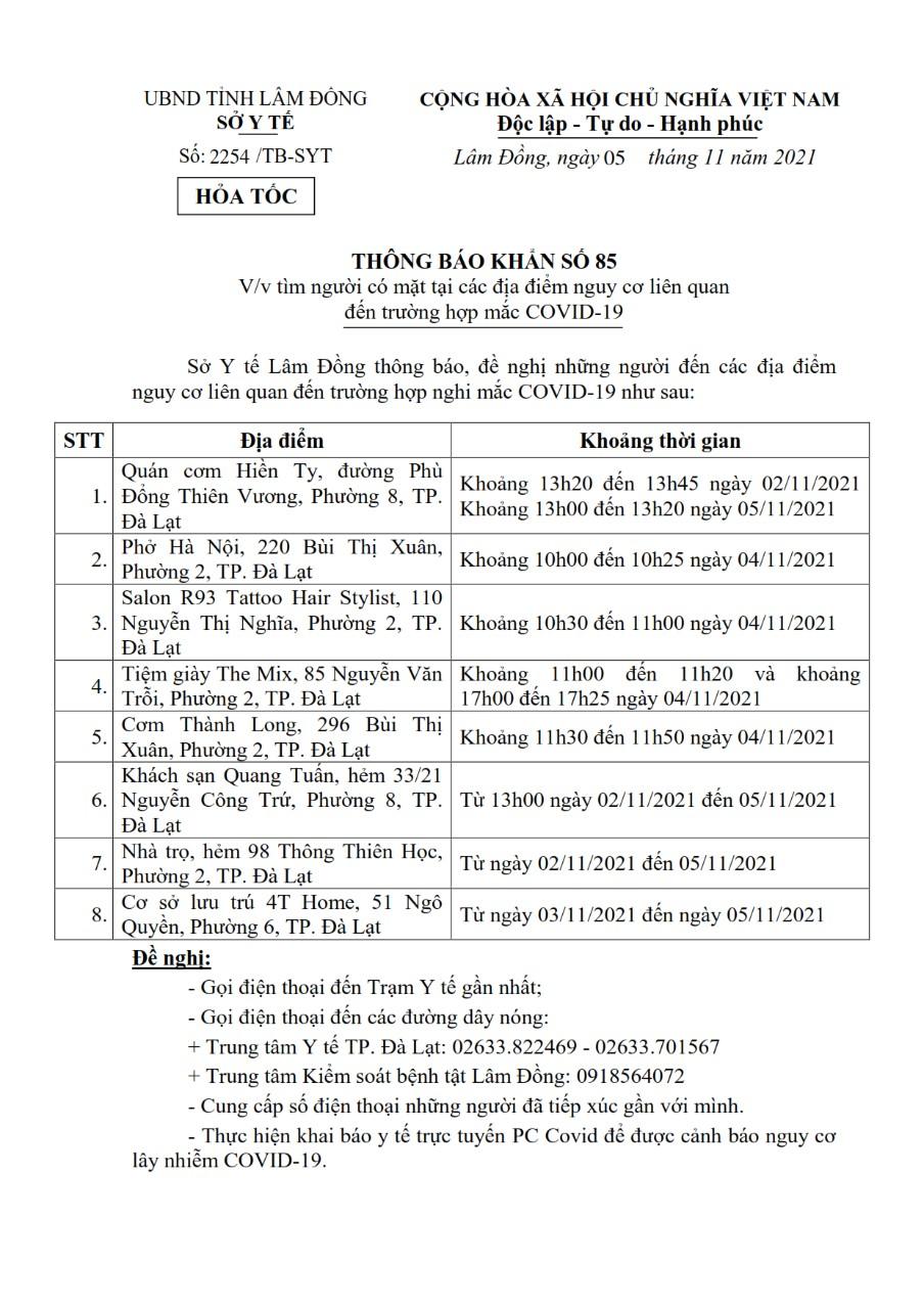Sở Y tế Lâm Đồng ban hành văn bản số 2254/TB-SYT ngày 06/11/2021 về việc tìm người có mặt tại các địa điểm nguy cơ liên quan đến trường hợp mắc COVID-19 tại Thành phố Đà Lạt và Huyện Lâm Hà.