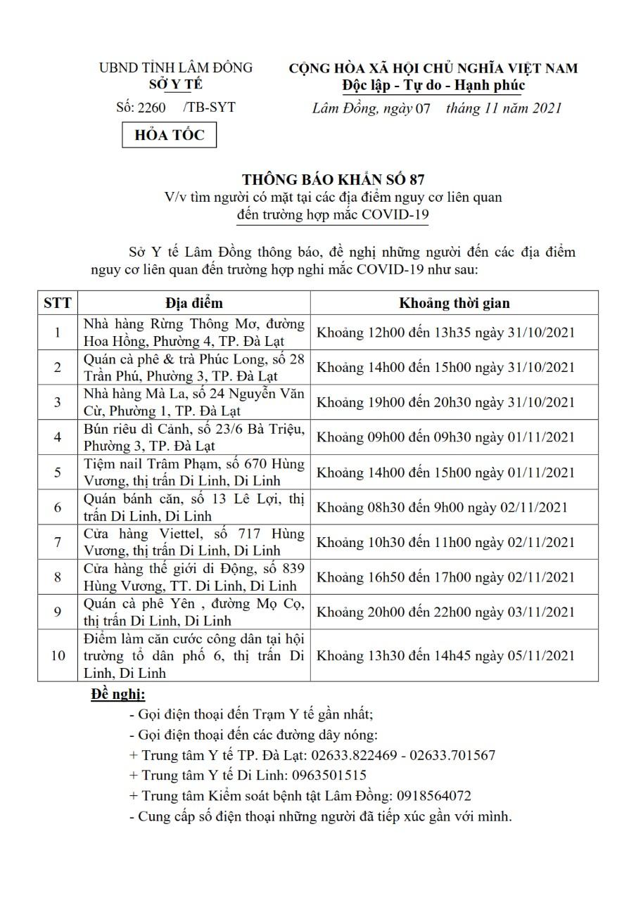 Sở Y tế Lâm Đồng ban hành văn bản số 2260/TB-SYT ngày 07/11/2021 về việc tìm người có mặt tại các địa điểm nguy cơ liên quan đến trường hợp mắc COVID-19 tại Thành phố Đà Lạt