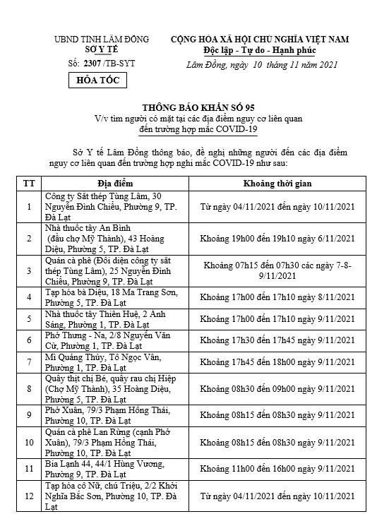 Sở Y tế Lâm Đồng ban hành văn bản số 2307/TB-SYT ngày 10/11/2021 về việc tìm người có mặt tại các địa điểm nguy cơ liên quan đến trường hợp mắc COVID-19