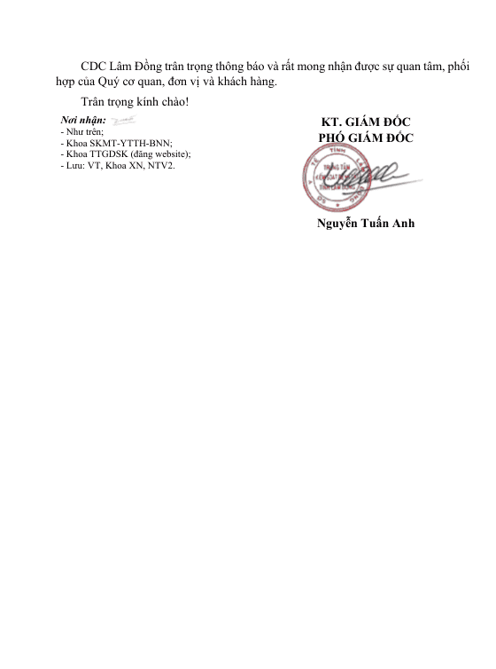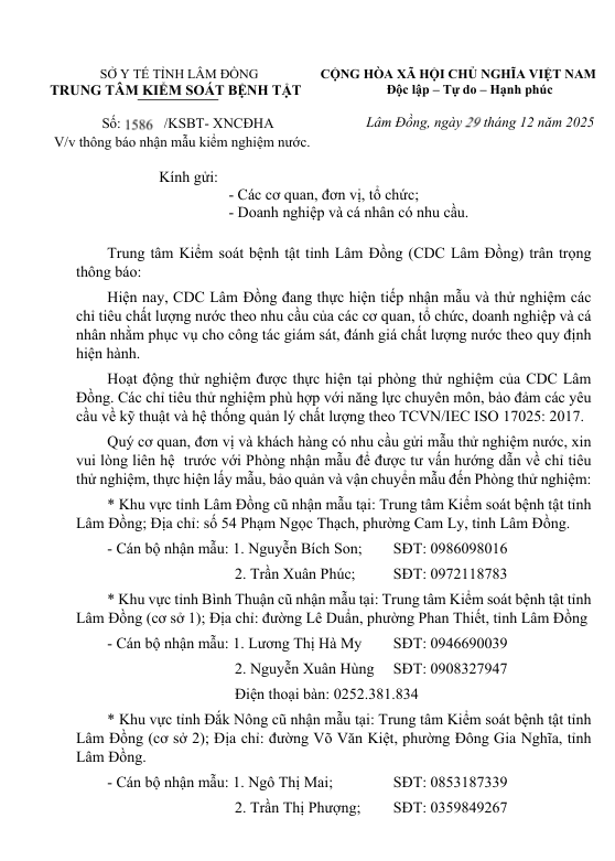 Báo cáp Kết quả ngoại kiểm chất lượng nước sạch sử dụng cho mục đích sinh hoạt tại Công ty Cổ phần Cấp thoát nước và Xây dựng Bảo Lộc năm 2025