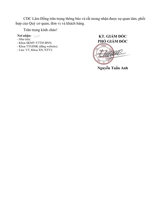 Thông báo triển khai, thực hiện thu phí dịch vụ kiểm dịch Y tế biên giới tại các cửa khẩu đường bộ (Bu Prăng, Đắk Peur) trên địa bàn tỉnh Lâm Đồng
