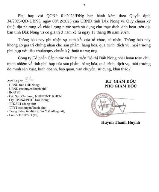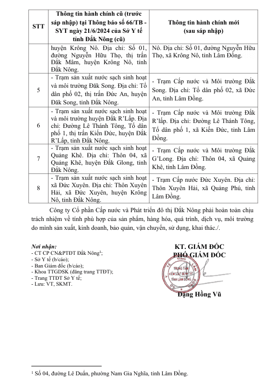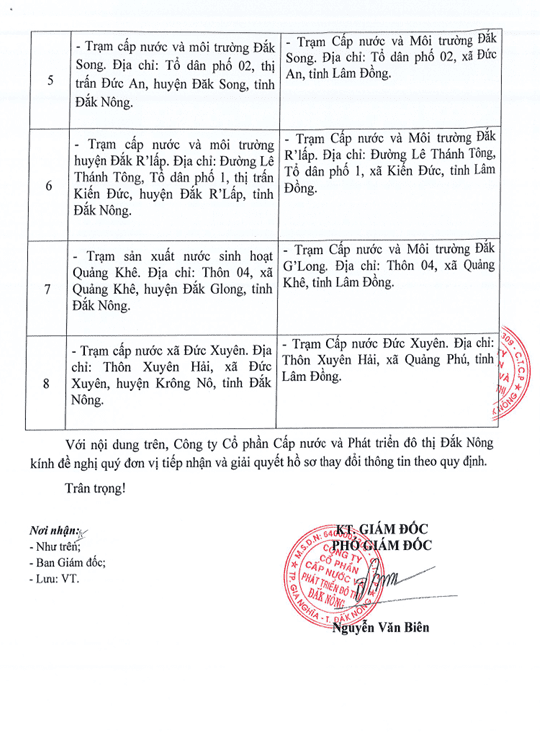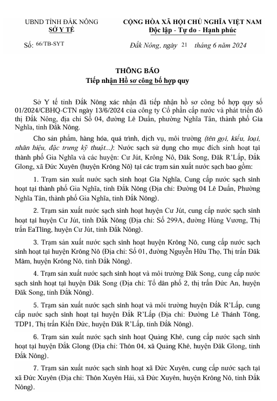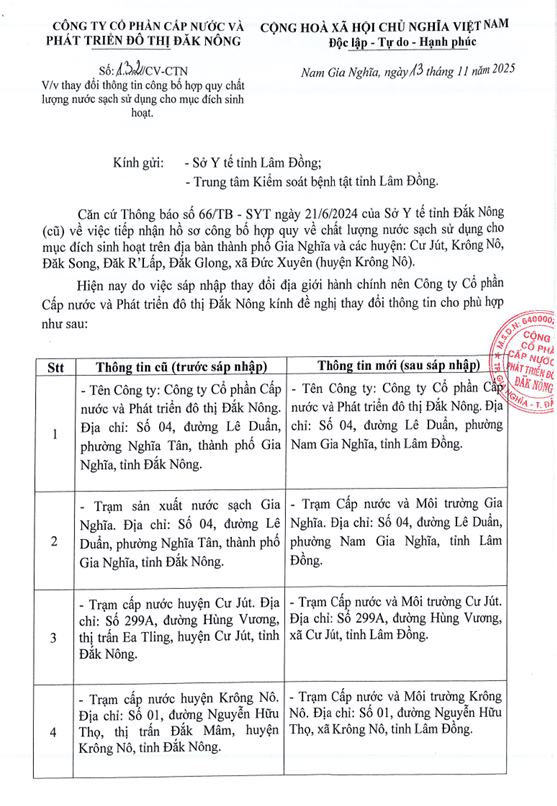 Thông báo Thay đổi thông tin hành chính hồ sơ công bố hợp quy - Nhà máy nước Đắk Mil