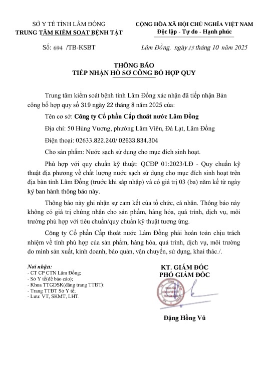 Thông báo tiếp nhận hồ sơ công bố hợp quy - Công ty Cổ phần Cấp thoát nước Lâm Đồng