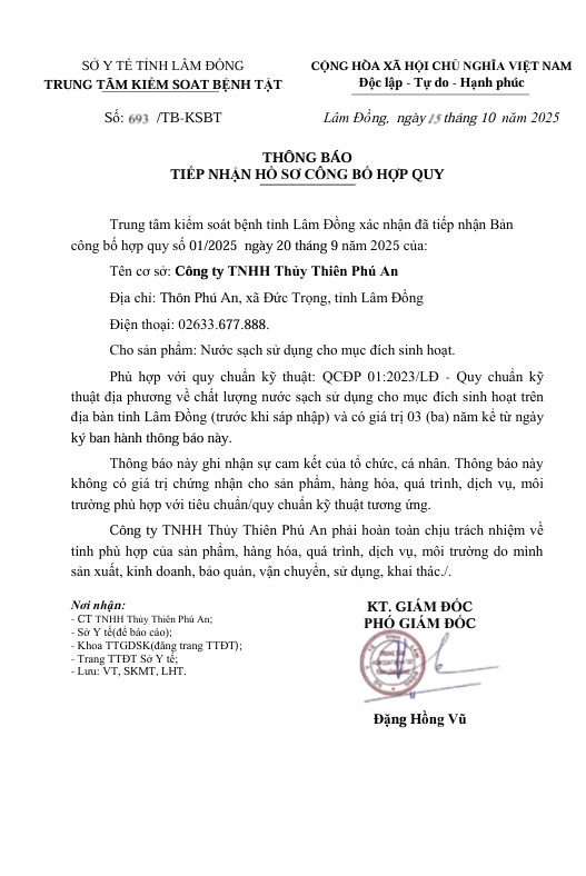 Thông báo tiếp nhận hồ sơ công bố hợp quy - Công ty Cổ phần Cấp thoát nước Lâm Đồng