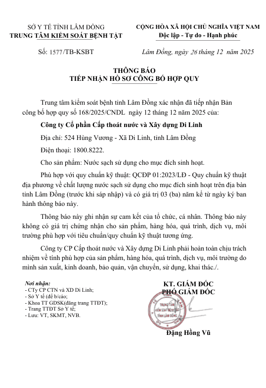 Cập nhật lúc: 09:09 - 26/12/2025 Thông báo tiếp nhận hồ sơ công bố hợp quy của Cty CTN và XD Di Linh năm 2025 | Giới thiệu