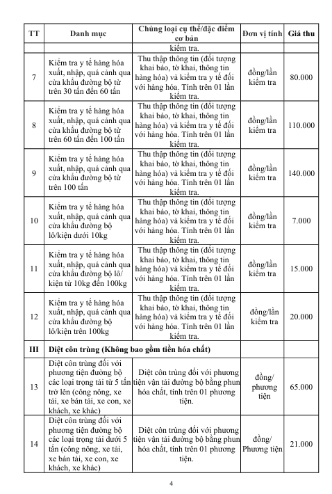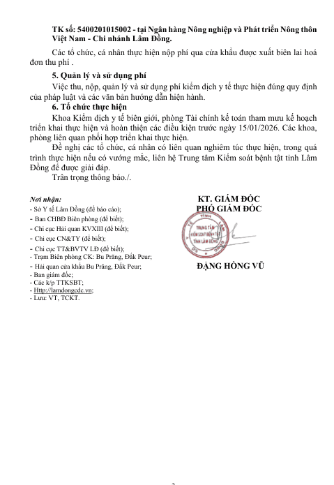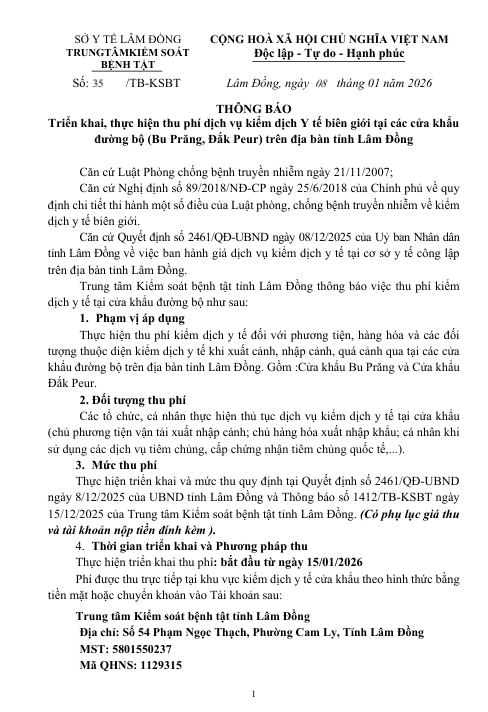 Thông báo Triển khai, thực hiện thu phí dịch vụ kiểm dịch Y tế biên giới tại các cửa khẩu đường bộ (Bu Prăng, Đắk Peur) trên địa bàn tỉnh Lâm Đồng