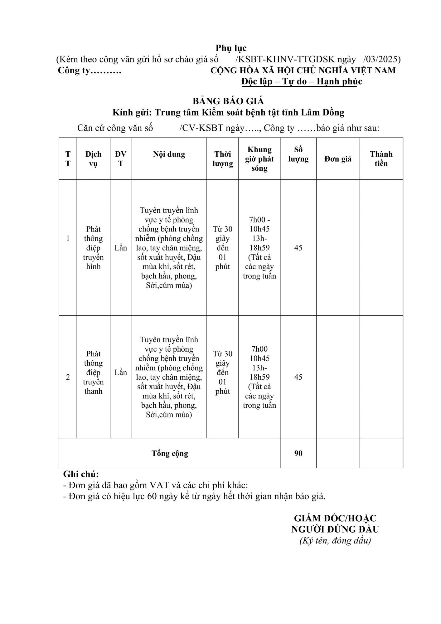 Cập nhật lúc: 09:49 - 04/03/2025 Thông báo Gửi hồ sơ chào giá Gói thầu tuyên truyền phòng chống dịch bệnh trên Đài Phát thanh Truyền hình (lần 3) | Giới thiệu