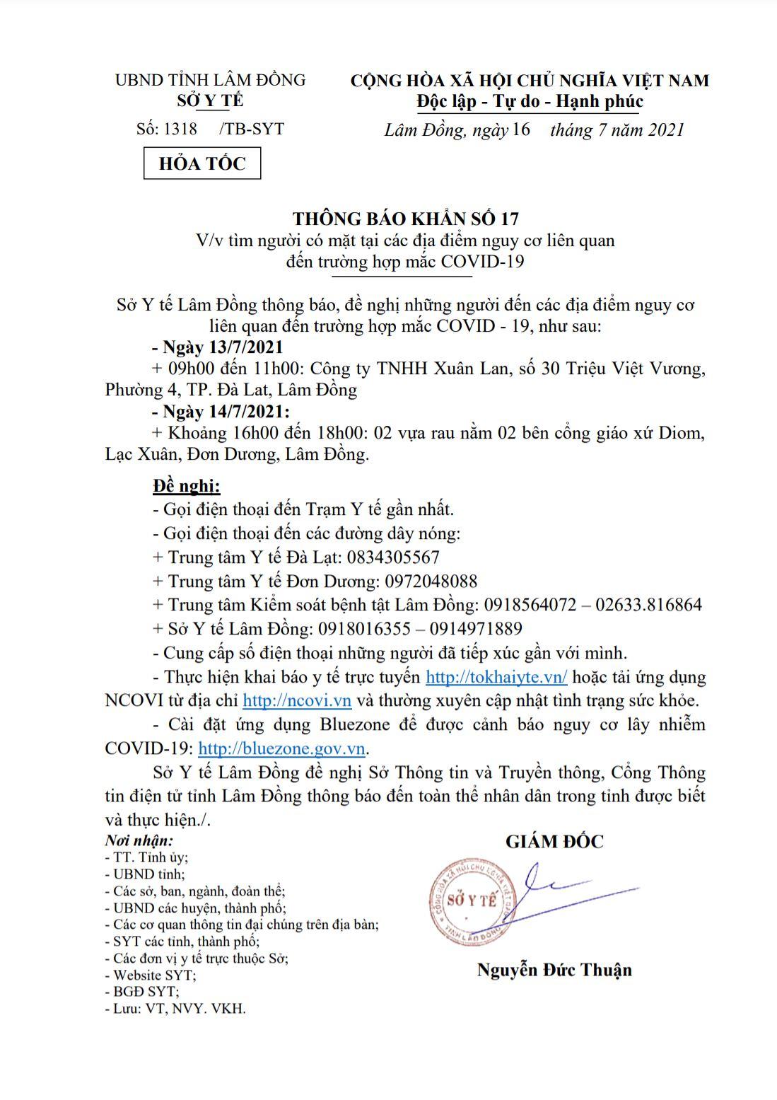 THÔNG BÁO KHẨN SỐ 17 (6h50 ngày 16/7/2021) về việc tìm người có mặt tại các địa điểm nguy cơ liên quan đến trường hợp mắc COVID-19