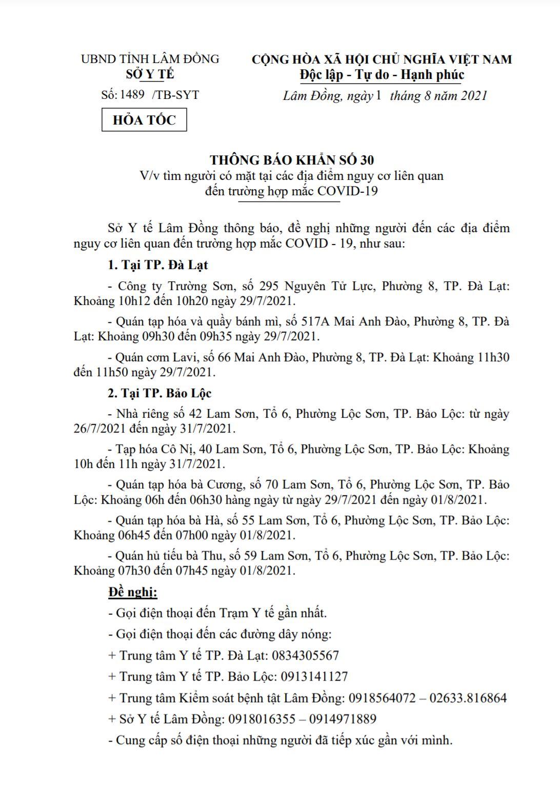 Sở Y tế Lâm Đồng ban hành văn bản số 1489/TB-SYT ngày 1/8/2021 về việc tìm người có mặt tại các địa điểm nguy cơ liên quan đến trường hợp mắc COVID-19.